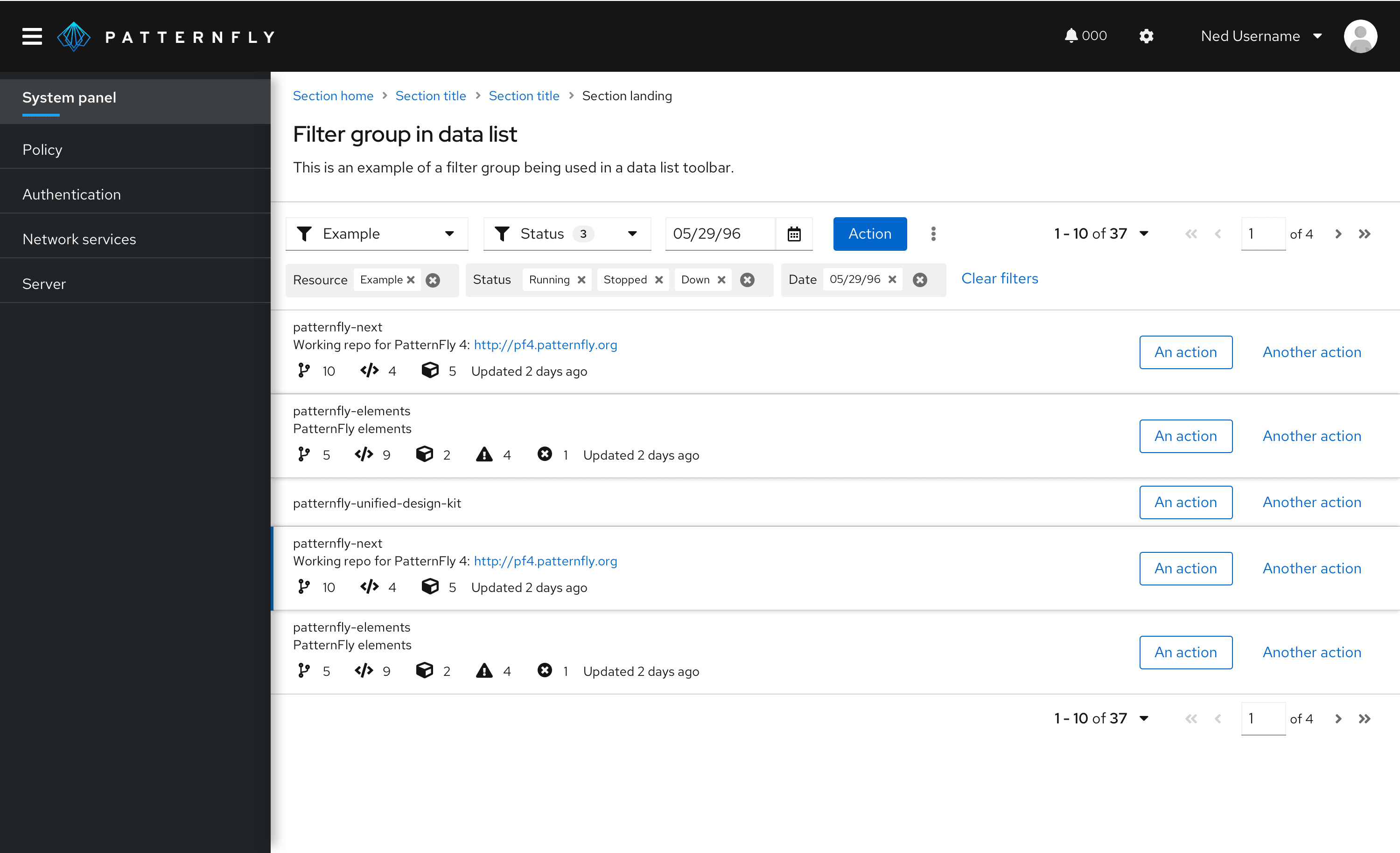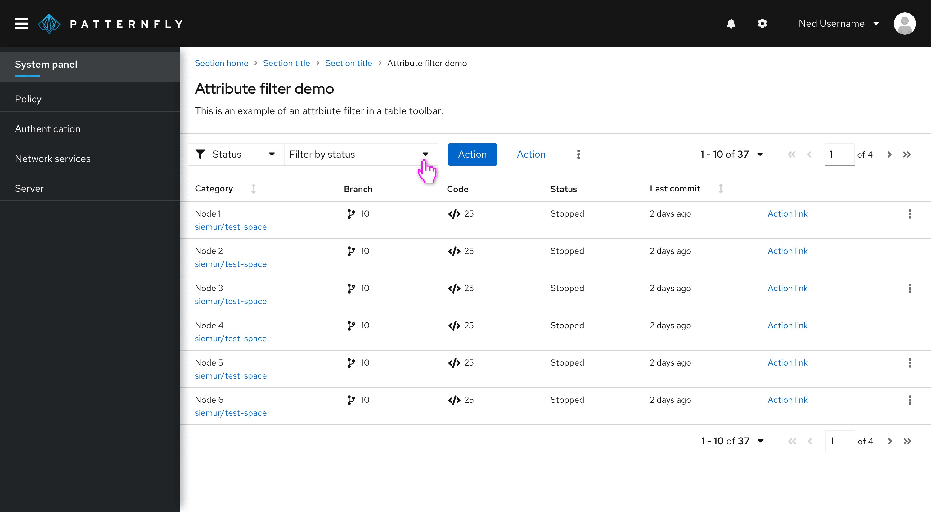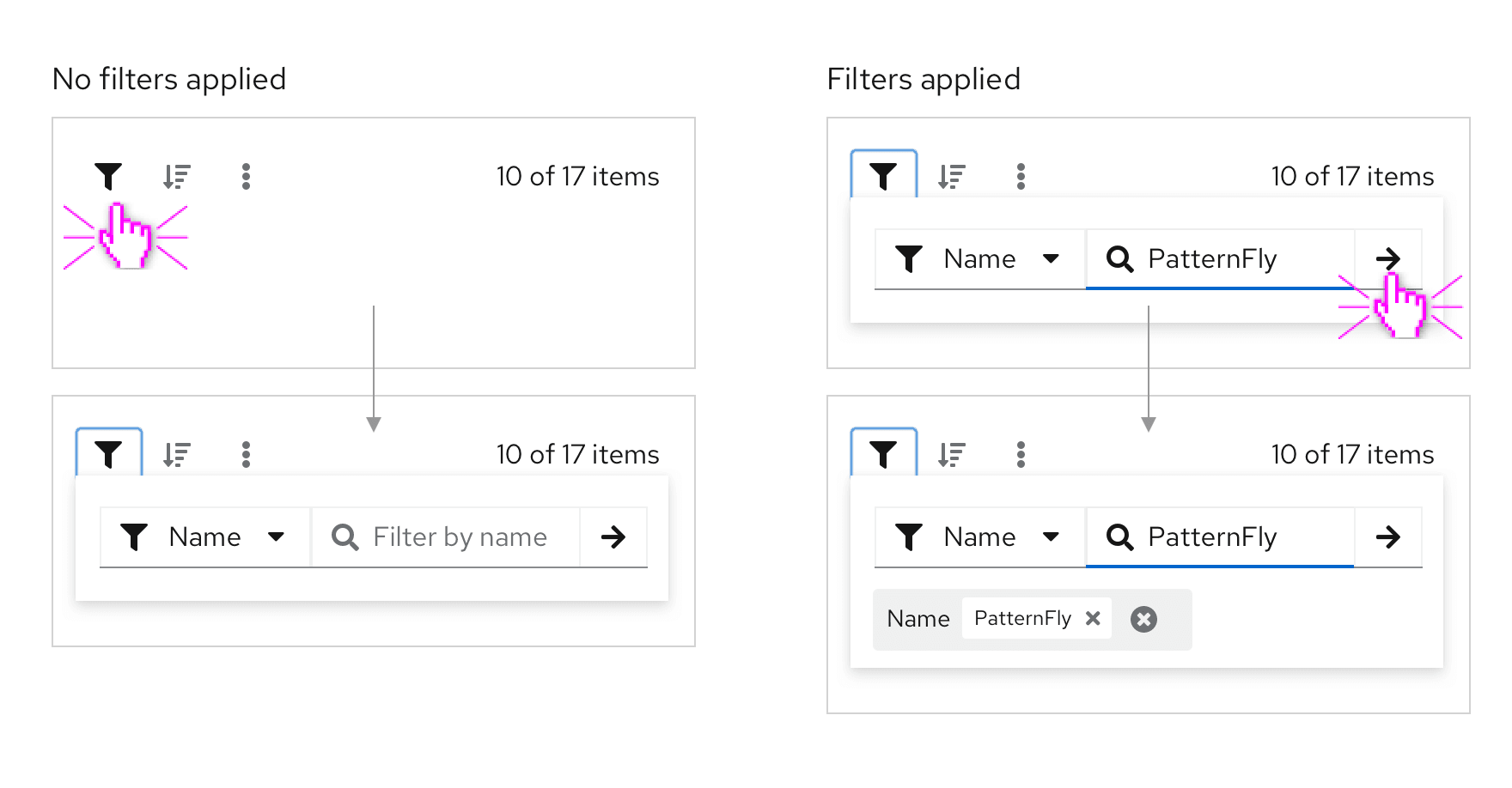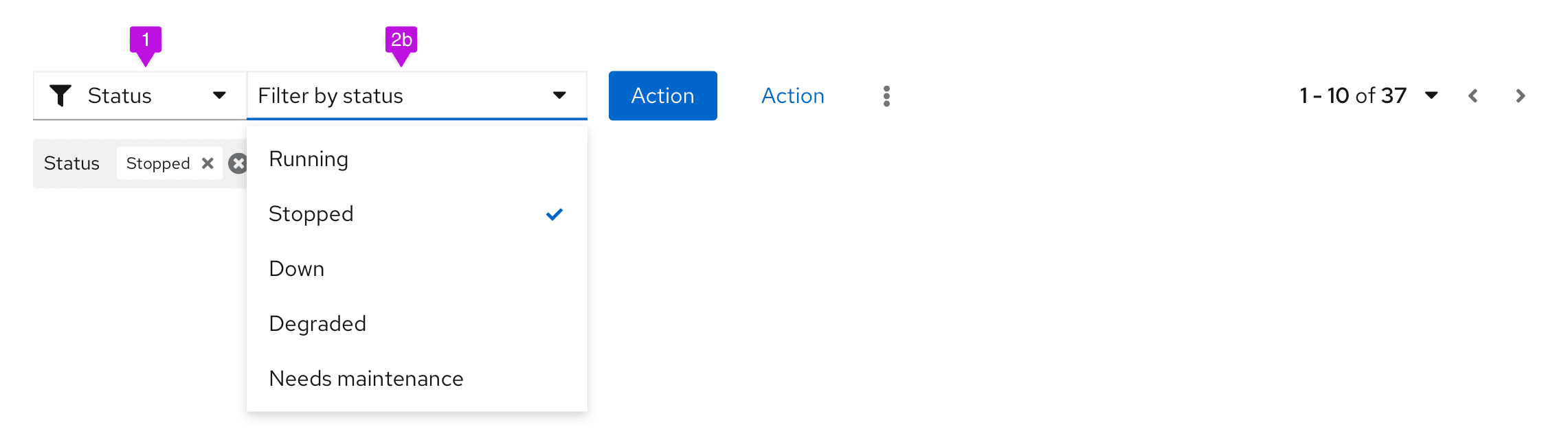 Filters can contain 1 attribute or multiple attributes. PatternFly components can be combined in different ways to create more complex filtering experiences. These different filter types can be used in a toolbar or on their own.