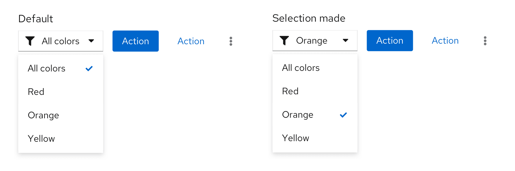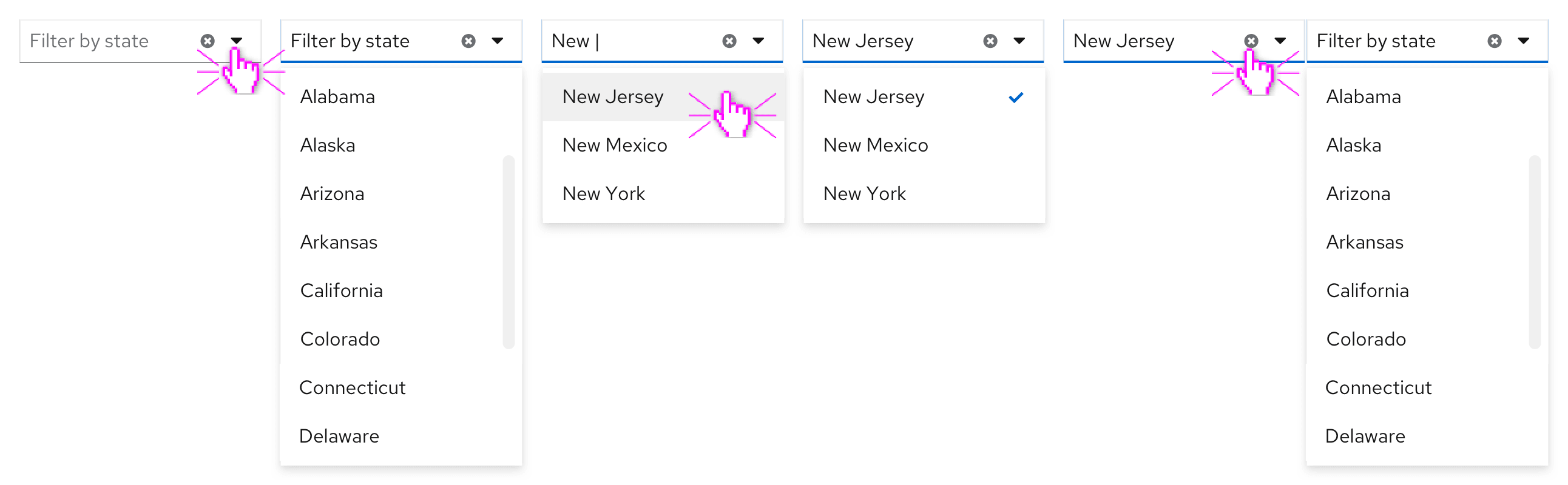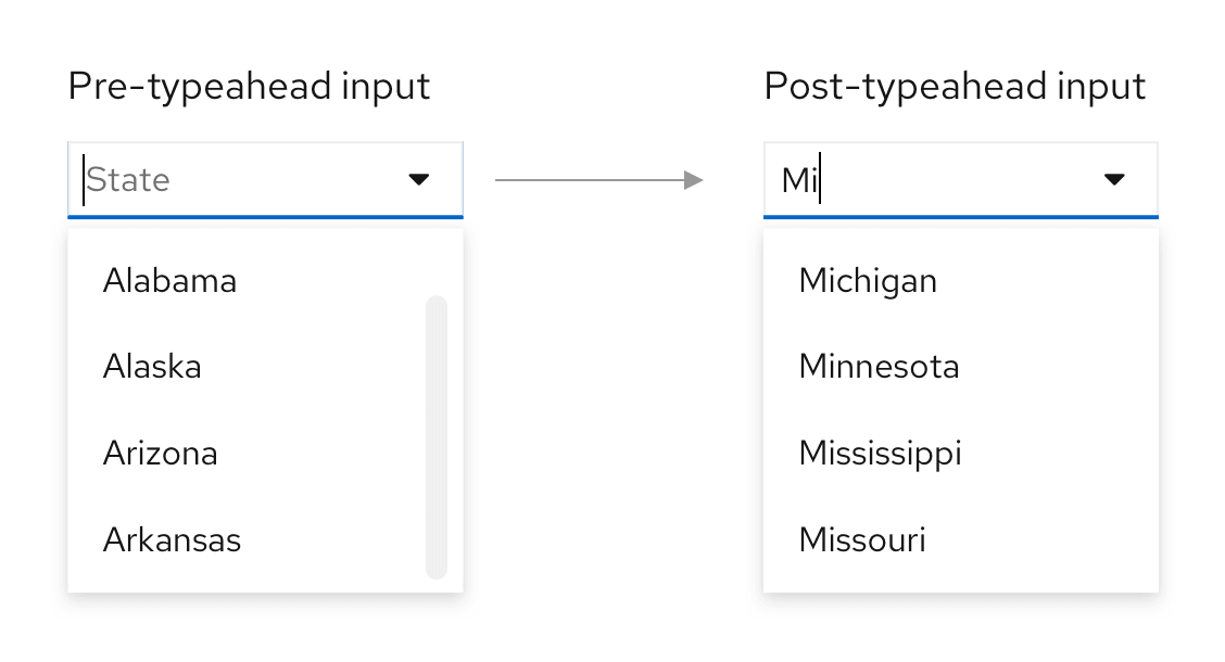 Typeahead functionality can be added to single selects, allowing users to input a search inside the toggle, filtering down from the list of menu options shown. This is especially useful for very long lists that would be inconvenient for the user to scroll through. typeahead is recommended for lists that are more than 10 items long.